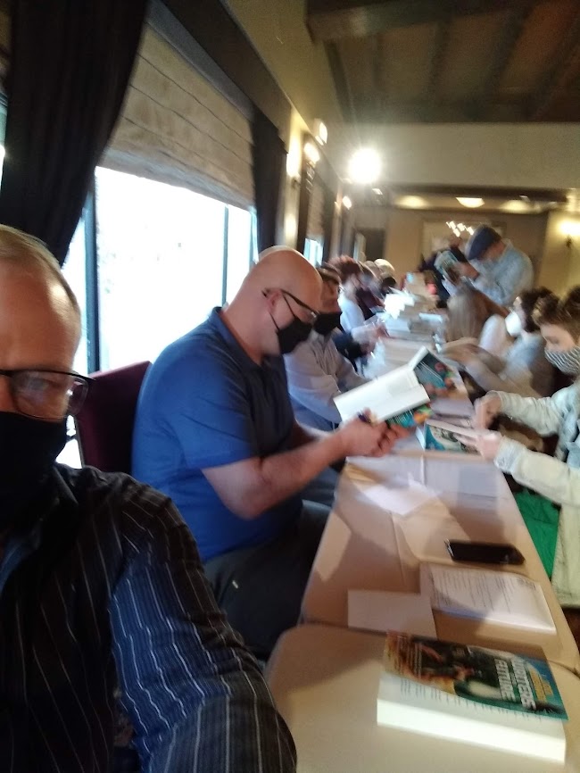 Today, for example, was full of the sorts of events that drain me socially. After lectures from Kevin J. Anderson, Rebecca Moesta, Dean Wesley Smith, and Todd McCaffrey, to name just a few, we formed an assembly line and each signed several hundred copies of our book. Book signings are strange: common sense (and Dean Wesley Smith) dictate that it’s a bad idea to use your legal bank signature for this purpose, so you have to make up a new one, which feels unnatural. You want to personalize, experiment, and savor what you’re doing, but there’s no time.